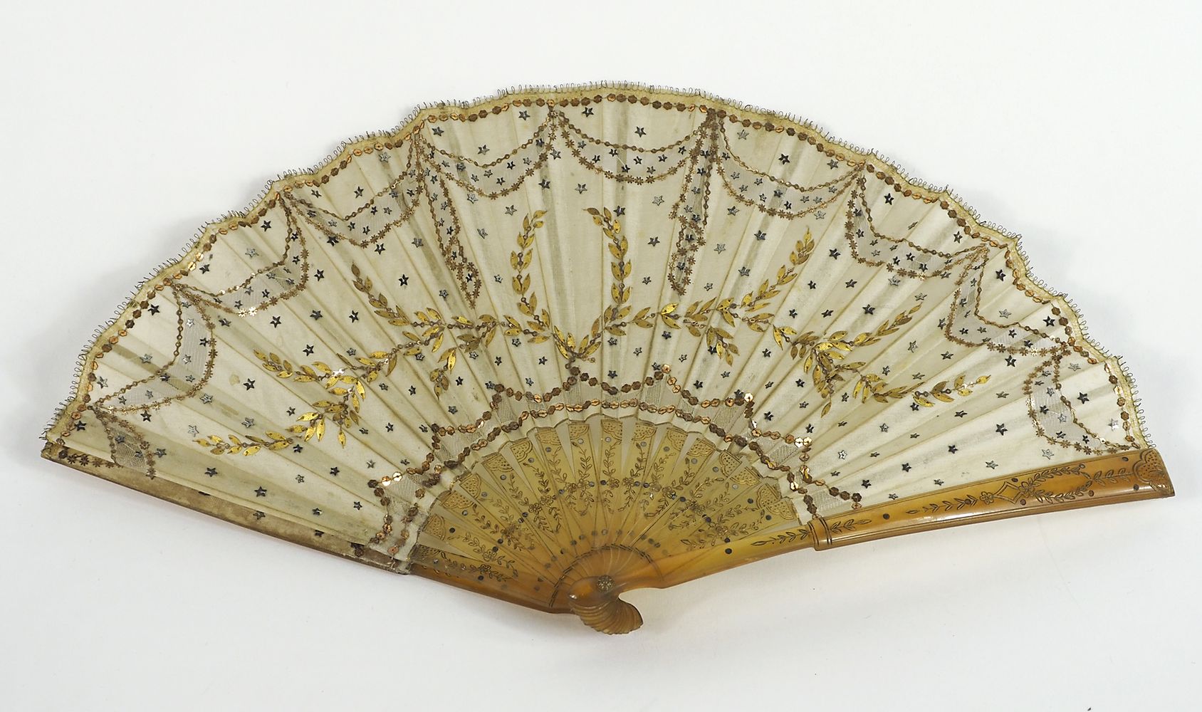 Piccolo ventaglio con stecche in tartaruga bionda e decori dorati. Inizio XX...