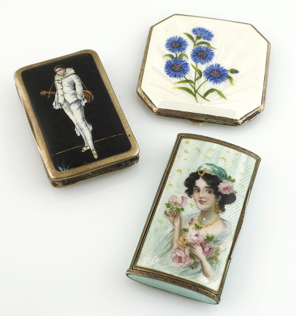 Lotto di 3 scatolette in argento decorate a smalti policromi.