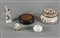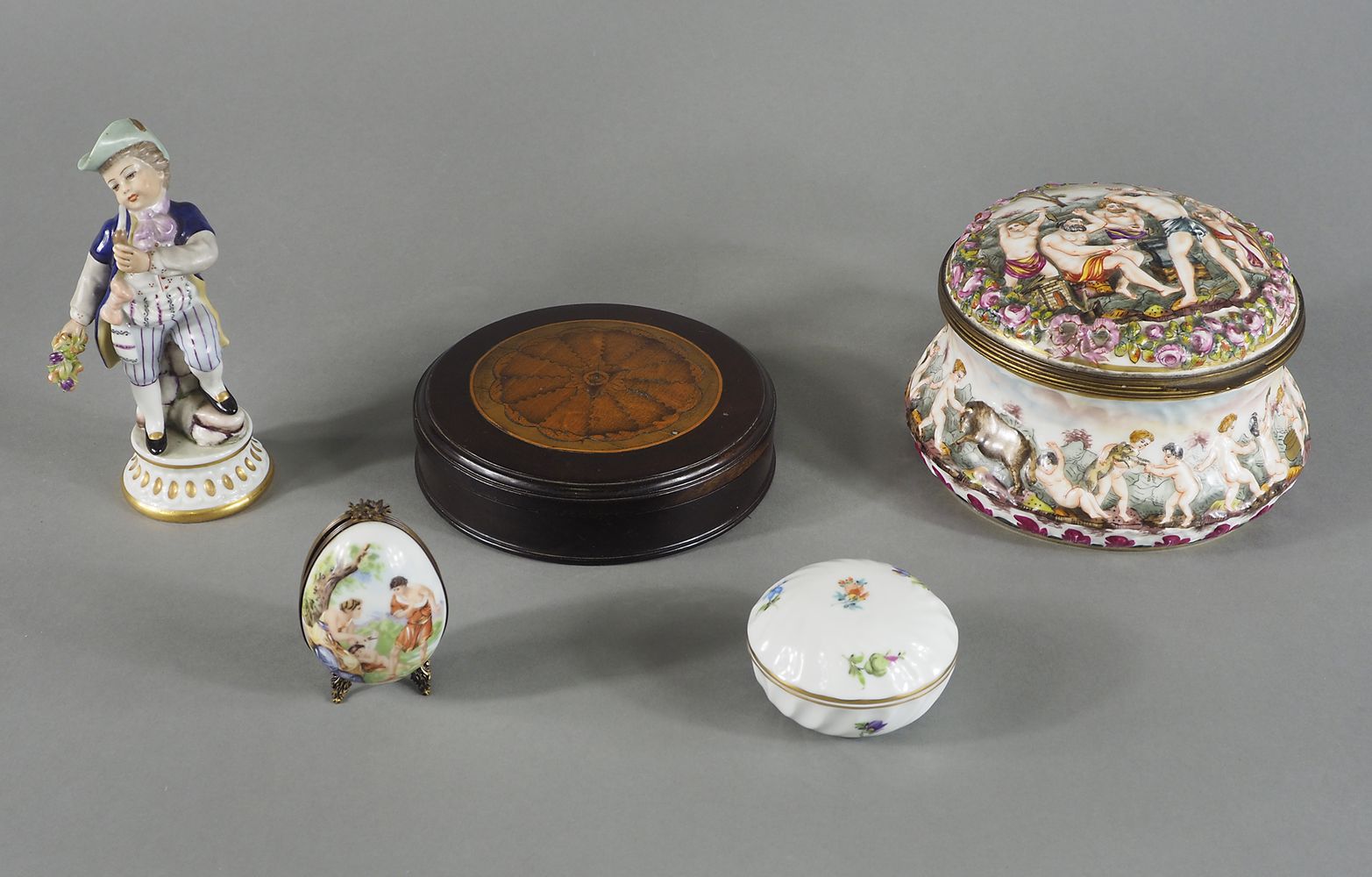 Lotto di 5 oggetti vari tra cui scatola portagioie e statuina in porcellana.