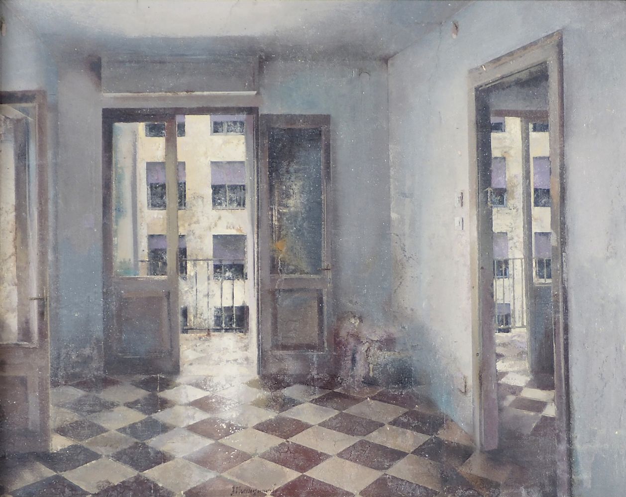 Matteo Massagrande 1959 "Poggiolo" cm. 40x50 - tecnica mista su tavola Firmato b al centro. Autentica dell'Artista su fotografia con timbro Galleria Sindoni.