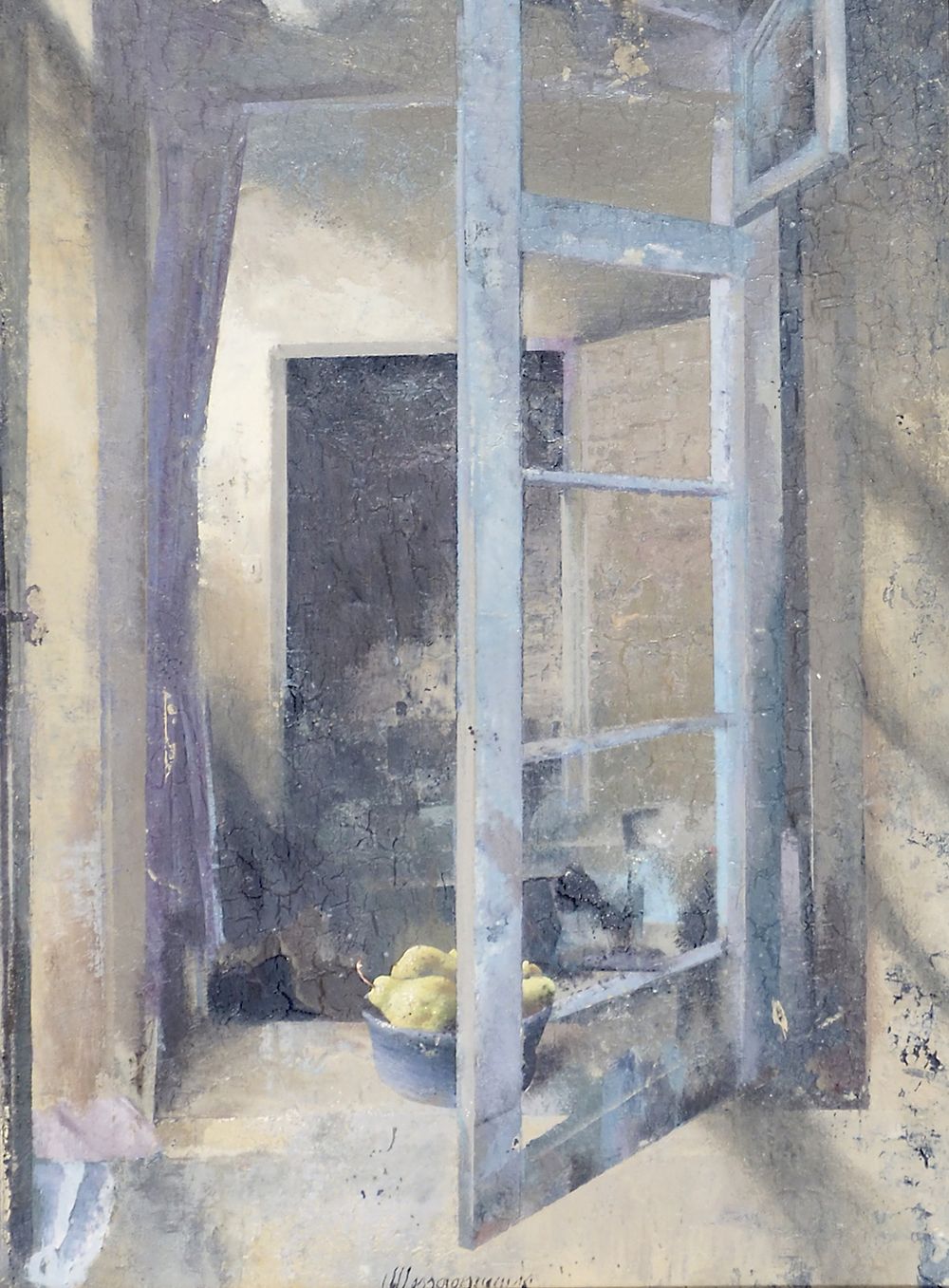 Matteo Massagrande 1959 "FInestra" cm. 40x30 - tecnica mista su tavola Firmato b. al centro. Autentica dell'Artista su fotografia con timbro Galleria Sindoni.