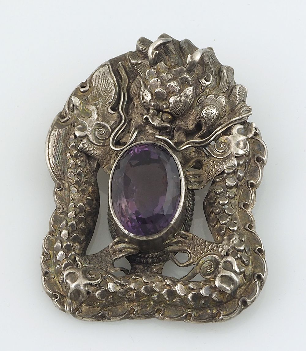 Spilla indiana in argento finemente lavorato con ametista centrale.