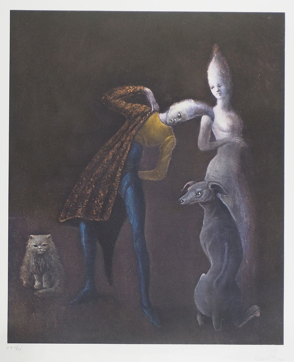 Leonor Fini Buenos Aires 1908-Parigi 1996 "Scena teatrale" cm. 70x50 - litografia a colori Firmato b. a d. Esemplare EA 2/20.