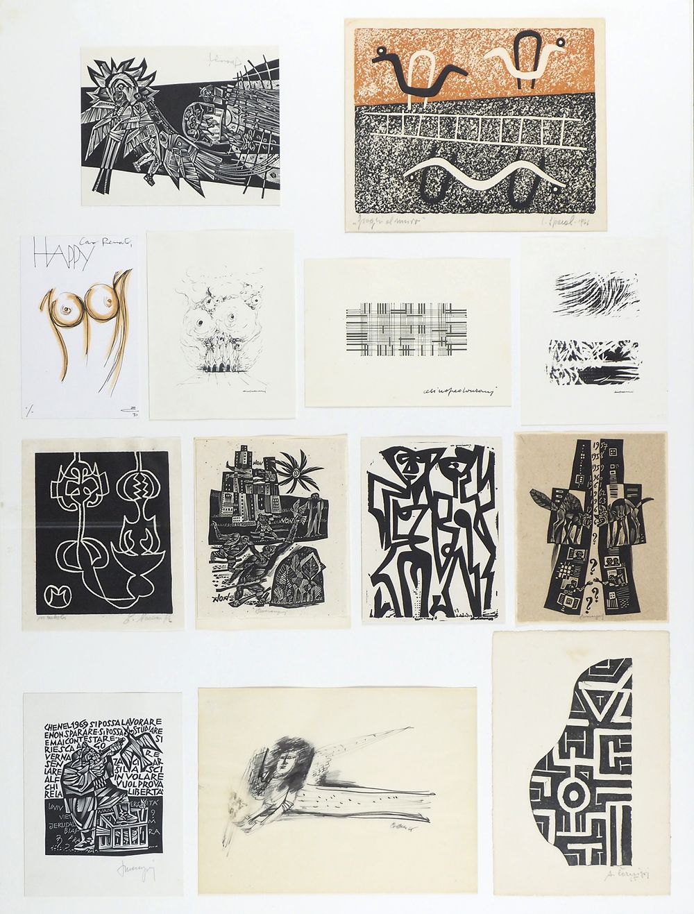Lotto di vari biglietti d'auguri dipinti da vari artisti triestini, entro unica cornice.