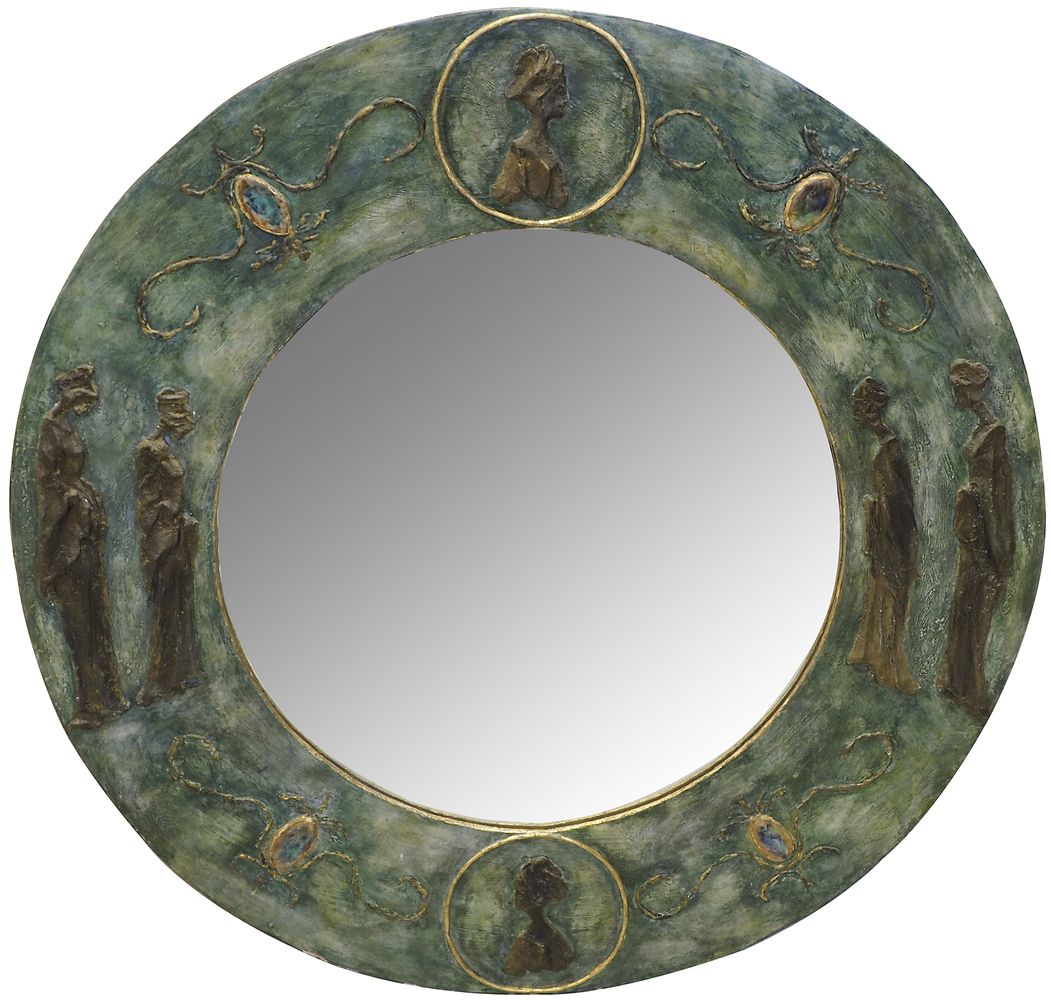 Lotto 442 | Specchio rotondo con cornice dipinta e sbalzata con figure. Diam. cm. 85.