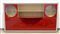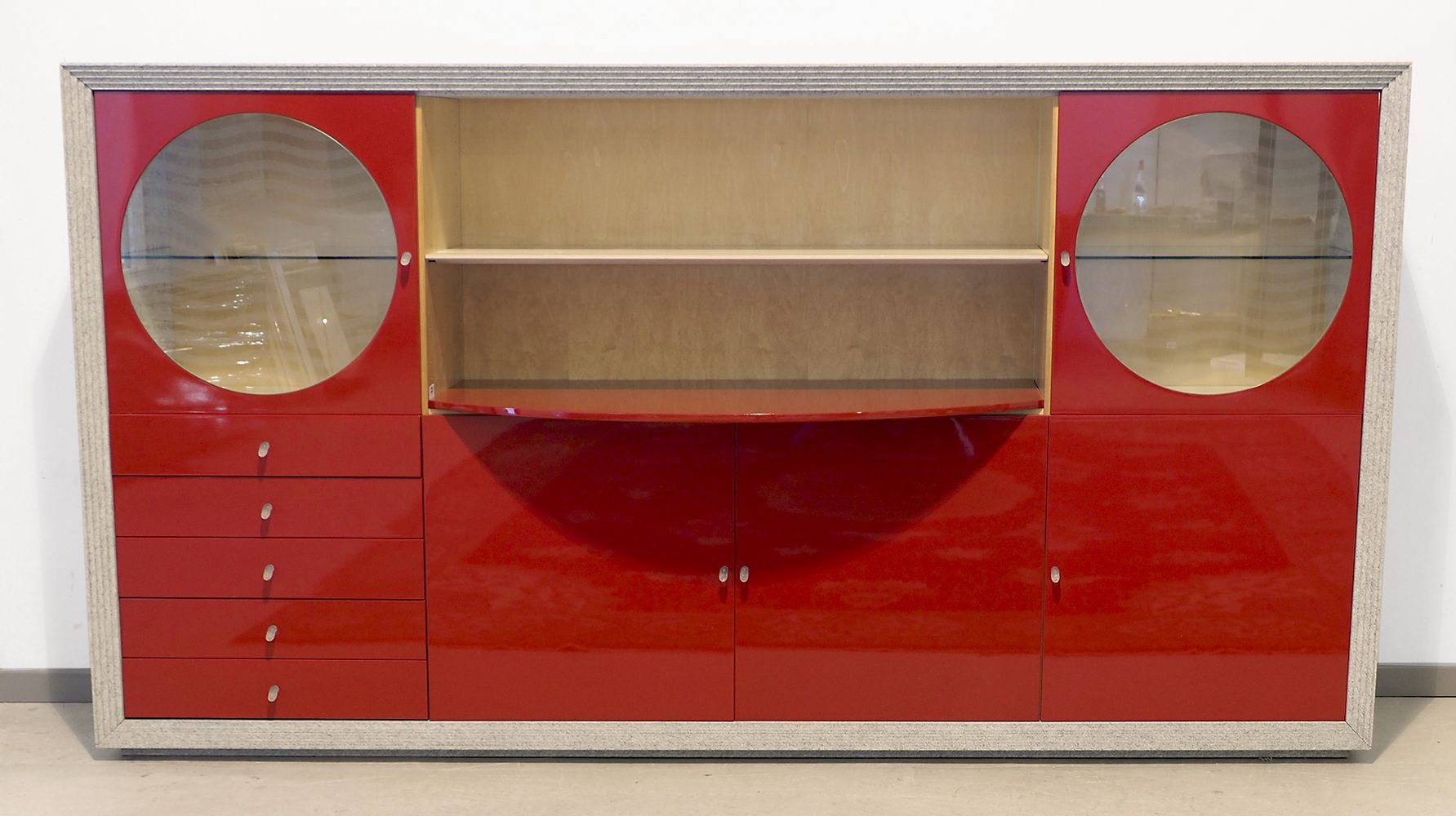 Lunga credenza laccata rossa con due ante a vetri rotondi, 3 ante e cassetti....