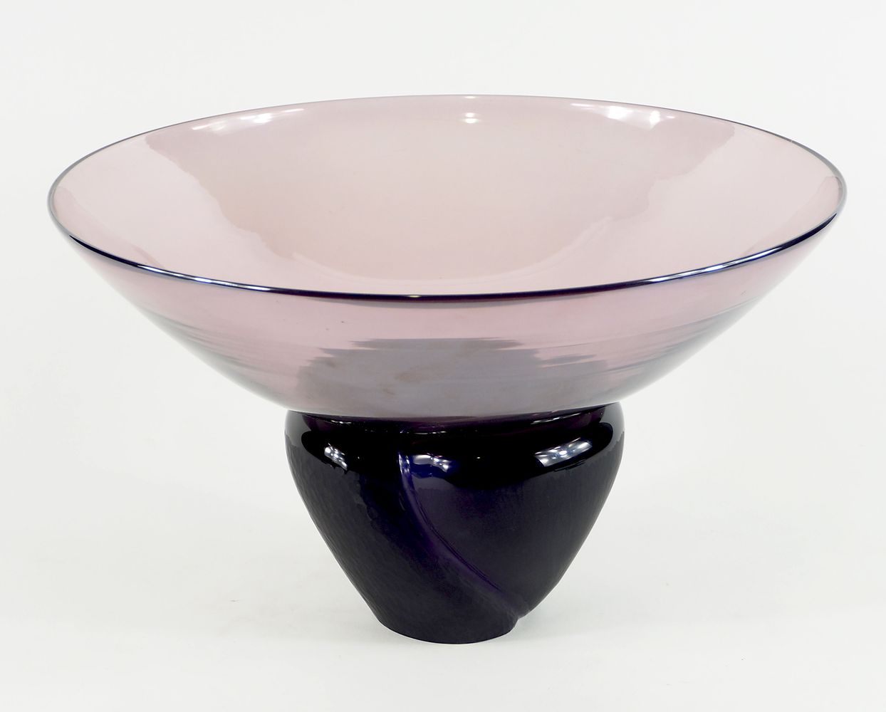 Venini: grande coppa in vetro ametista sorretta da base in vetro nero battuto. Firma incisa Venini Italia 85. H. cm. 26, diam. cm. 40.