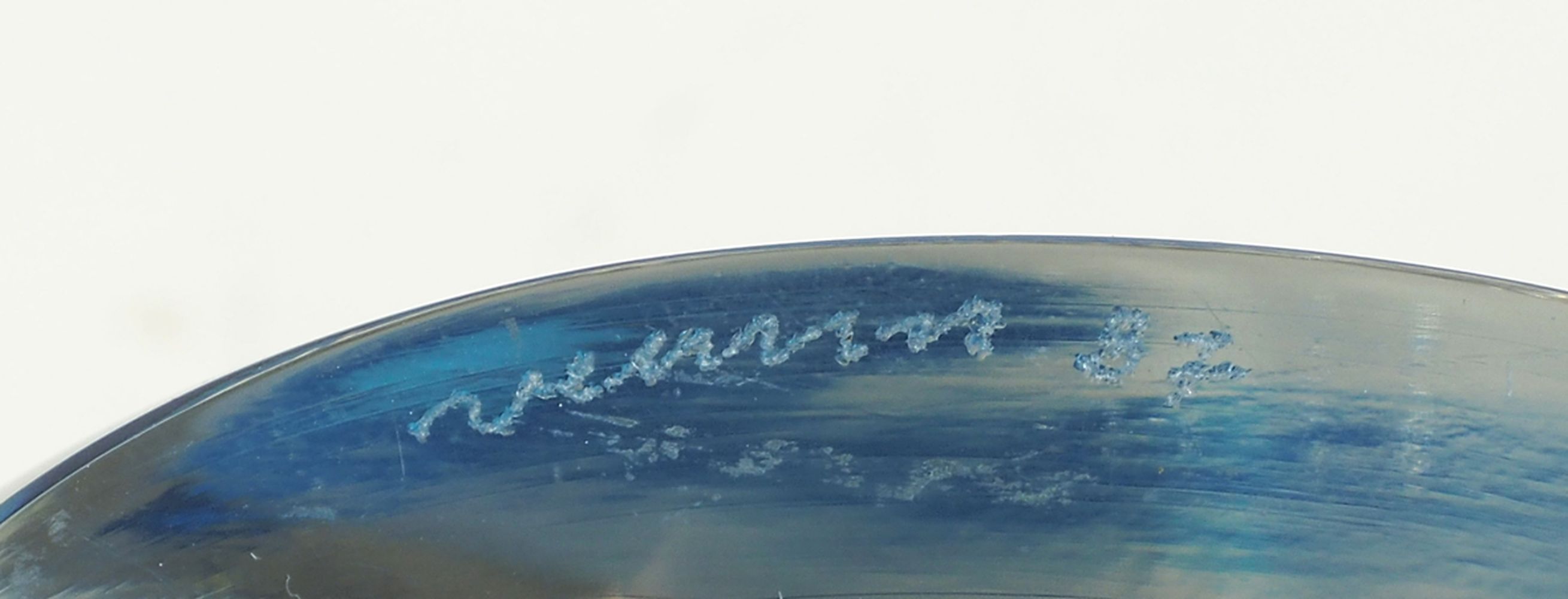 Venini: cubo in vetro trasparente con fascia azzurra, Firma incisa Venini 87....