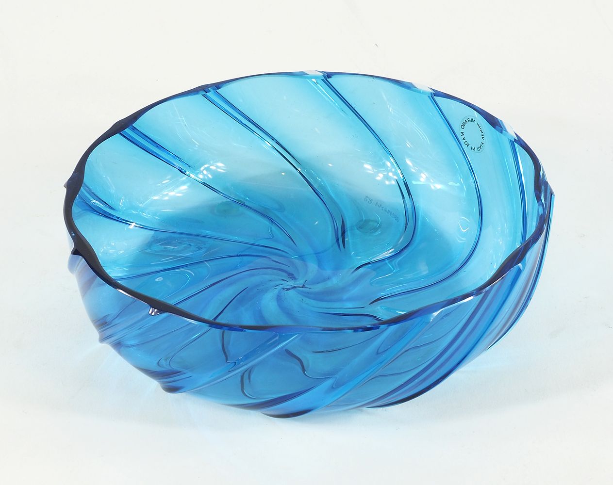 Venini: ciotola in vetro azzurro. Firma incisa Venini 88 ed etichetta trasparente. Diam. cm. 18,5.