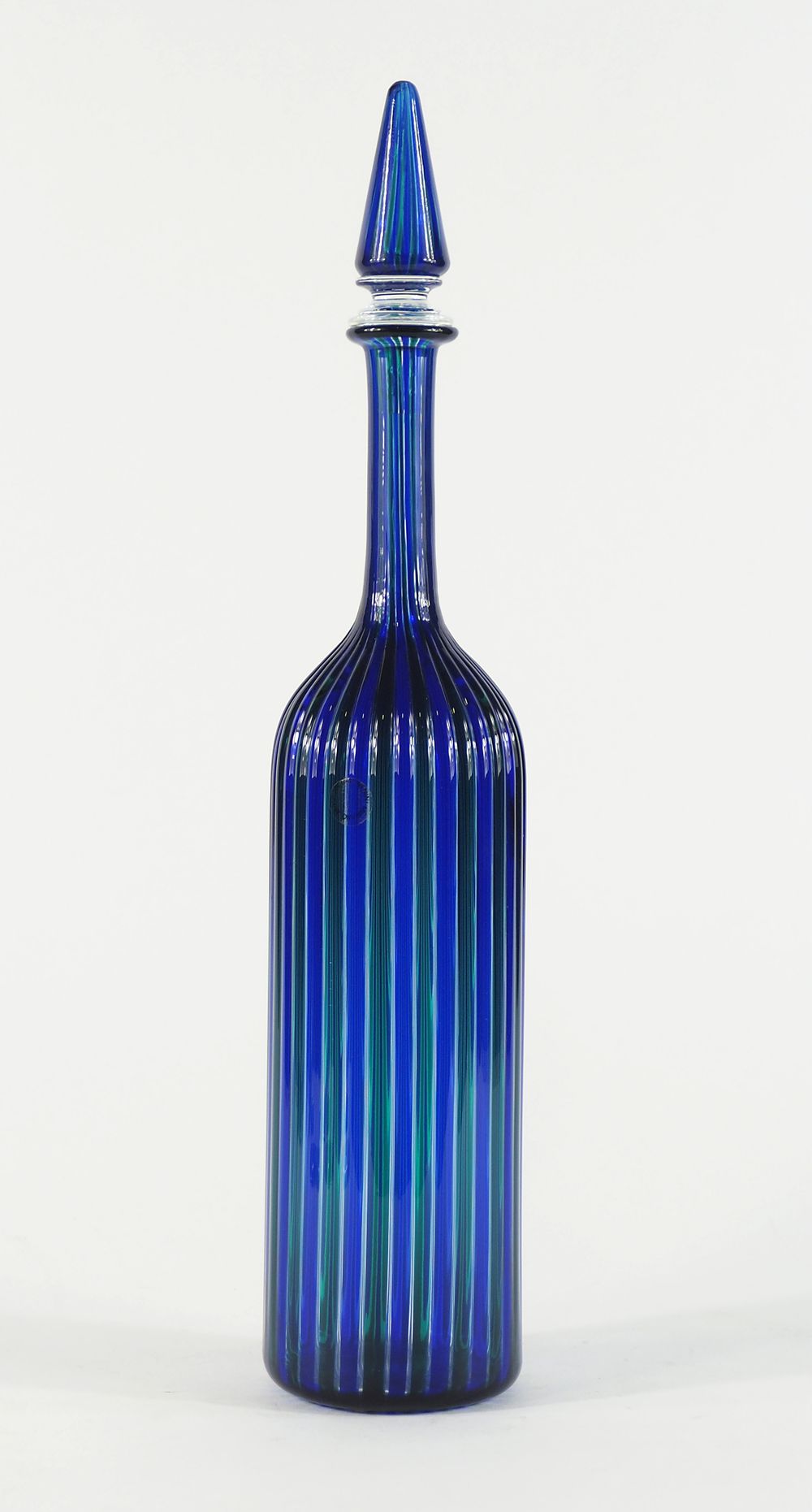 Venini: grande bottiglia della serie "morandiane" in vetro a canne verdi e blu con tappo a cono. Firma incisa Venini Italia 85 ed etichetta trasparente. H. tot cm. 46. Pubbl.: "Venini" L. Massoni editore 1978.