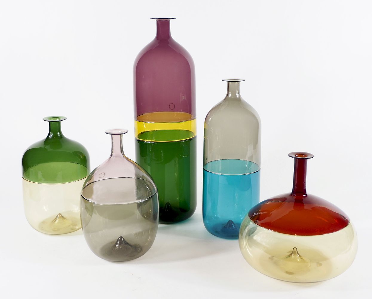 Venini: lotto di 5 bottiglie in vetro della serie "bolle", disegno di T....