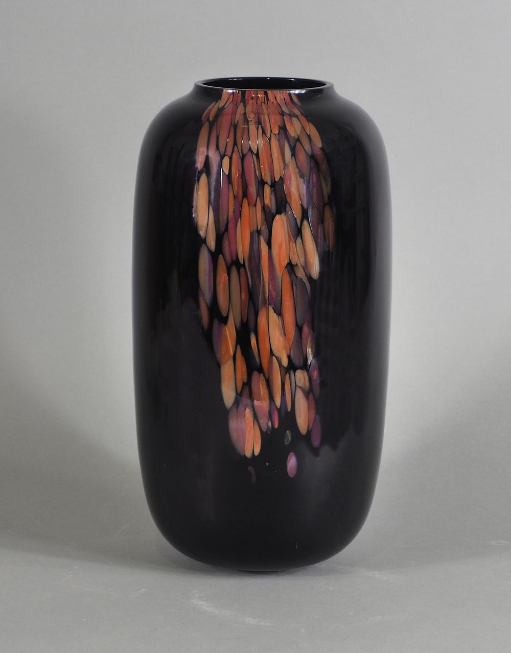 Venini: grande vaso in vetro nero con fascia a "pennellate". Firma incisa Venini Italia 81. H. cm. 36.