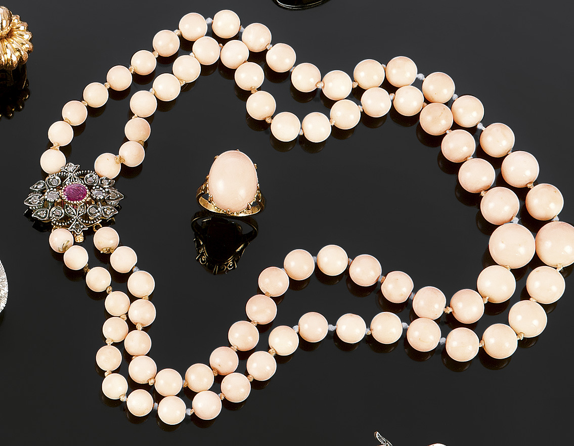 DEMI-PARURE Demi-parure in corallo rosa, pelle d'angelo, composta da collana a due fili di boules a scalare, fermaglio in oro giallo e argento con rubino di taglio ovale e diamanti; anello in oro giallo con corallo taglio cabochon di forma ovale