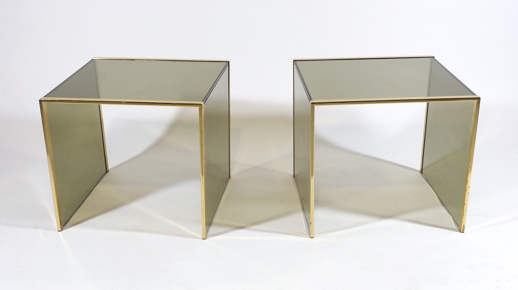 Coppia di tavolini bassi in ottone con ripiano in vetro fumè. cm. 43x49x48.