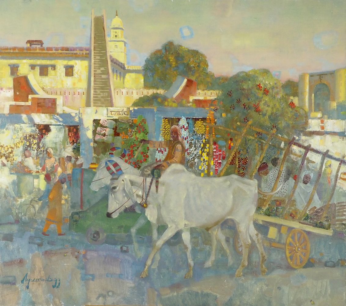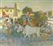 Ovanes Lousseguenov "Festa in paese" cm. 90x100 - olio su tela Firmato b. a s. e datato '99. Al retro firma e dati dell'opera in cirillico.