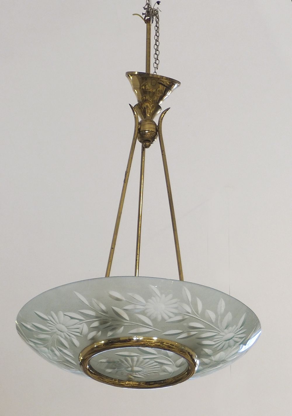 Lampadario in vetro satinato e ottone. Anni '50. H. cm. 88.
