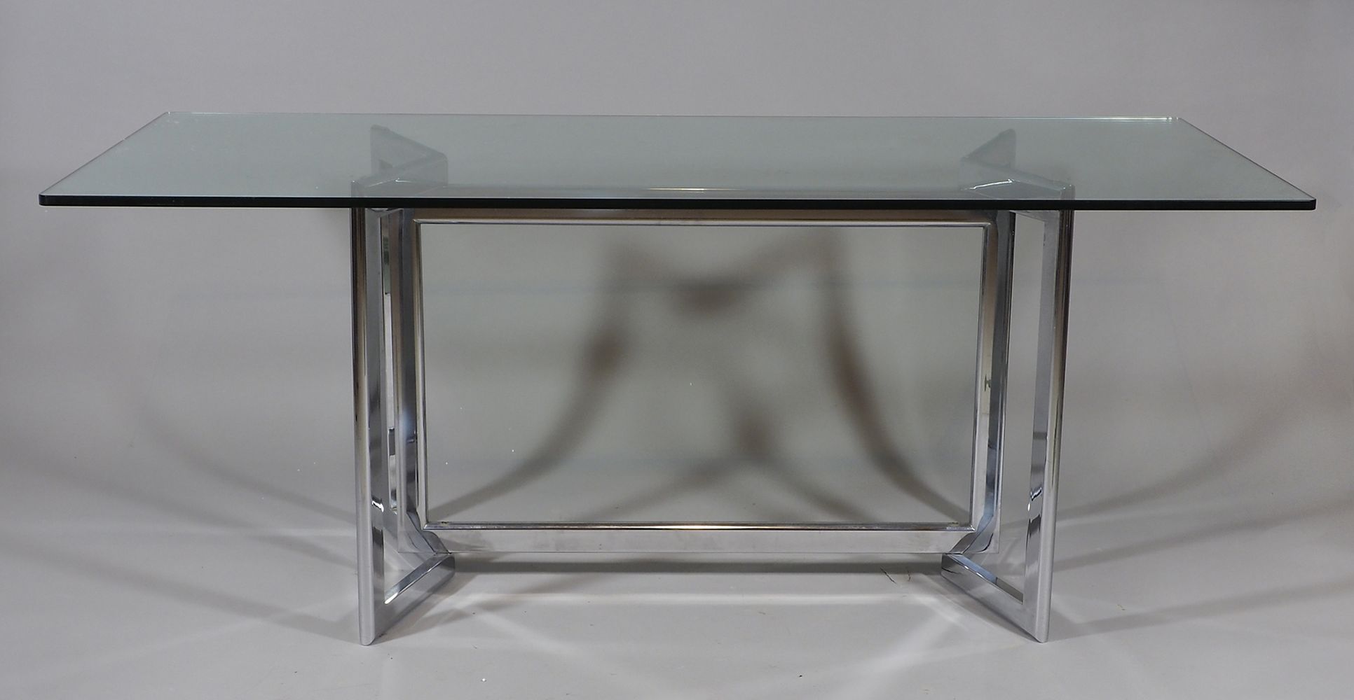 Sala da pranzo composta da tavolo in cristallo su base cromata a libro e 8...