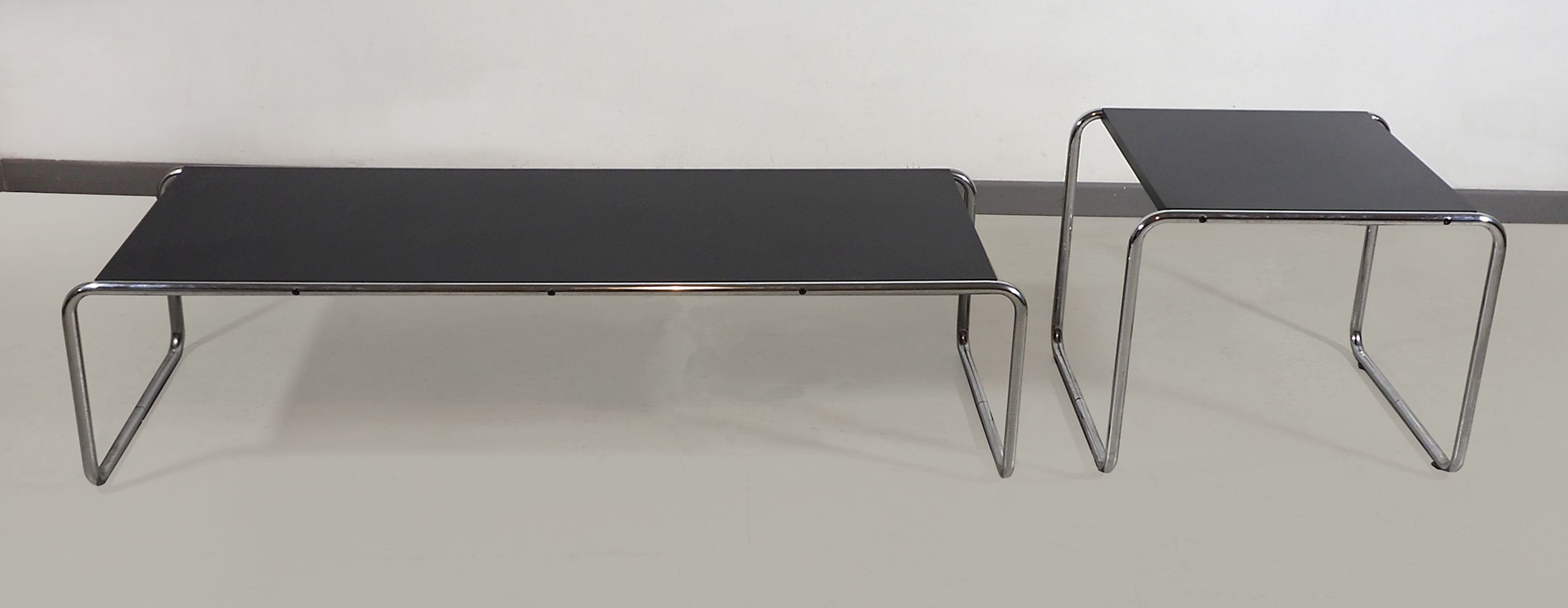 Gavina: lotto di 2 tavolini da caffè in acciaio modello Laccio. Con etichette originali, anni '60. Si tratta di copie dei tavolini disegnati da M. Breuer nel 1925 conosciuti con il nome Couchtisch Laccio.