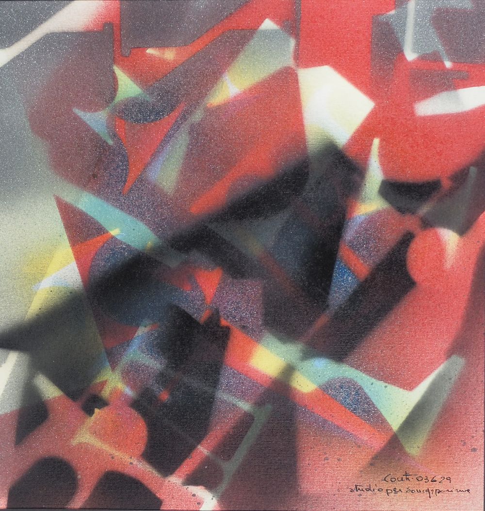 Paolo Conti 1938 "Composizione" cm. 32x34 - tecnica mista e spray Firma e titolo b. a d. Al retro timbro Studio d'arte G.R. Sacile.