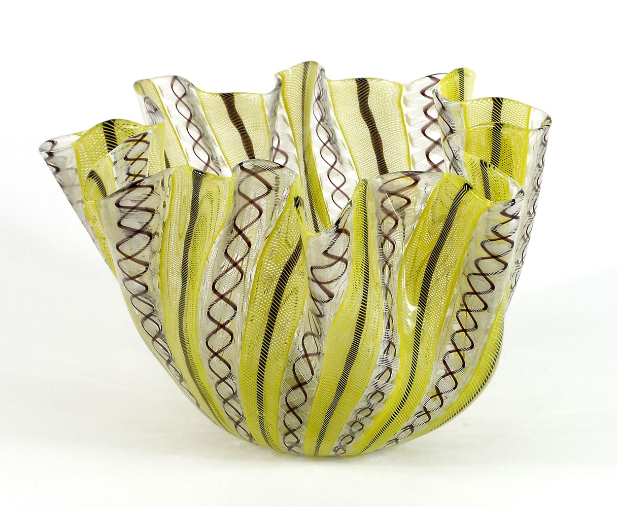 Venini: vaso "fazzoletto" in vetro con strisce verticali policrome. Disegno...