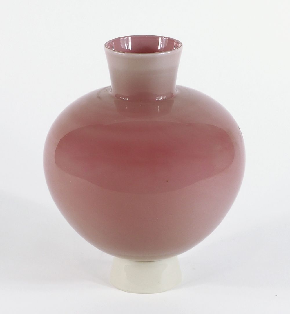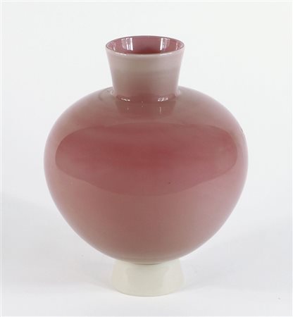 Venini: vaso in vetro rosa con base lattimo, Disegno di T. Buzzi. Firma...