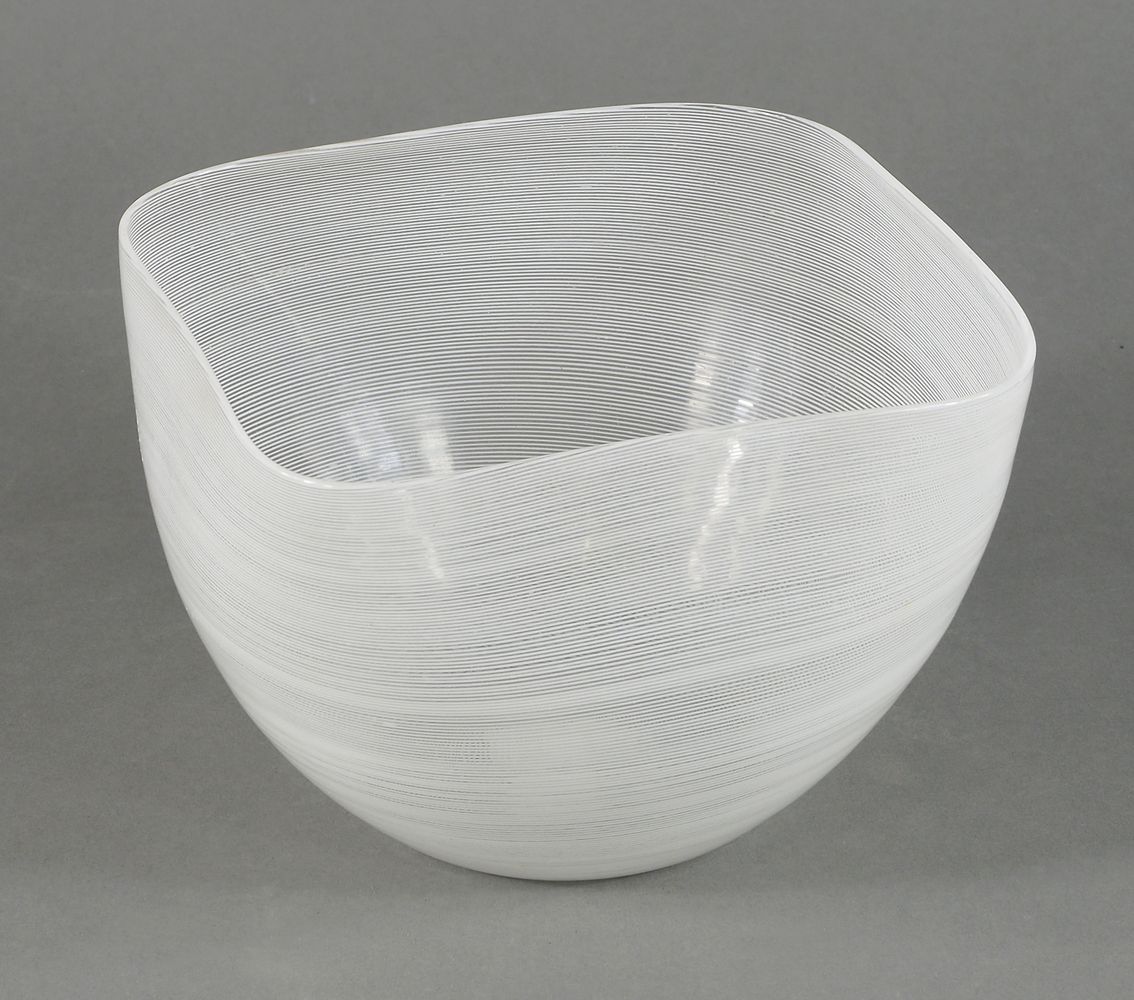 Venini: coppa in vetro trasparente a mezza filigrana. Disegno di C. Scarpa. Firma all'acido Venini Murano. cm. 10,5x15x15- Esposiz.: mostra "C. Scarpa, i vetri di un architetto", Palazzo Martinengo, Brescia 1997.