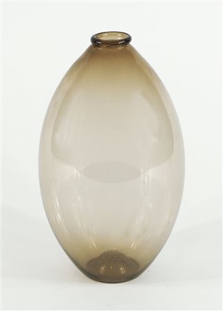vaso di forma ovale in vetro trasparente ambrato, disegno di V. Zecchin. H. cm. 23. Esposiz.: Mostra V. Zecchin, Palazzo Correr, Venezia 2002-2003; Mostra V. Zecchin, Isola di San Giorgio, Venezia 2017.