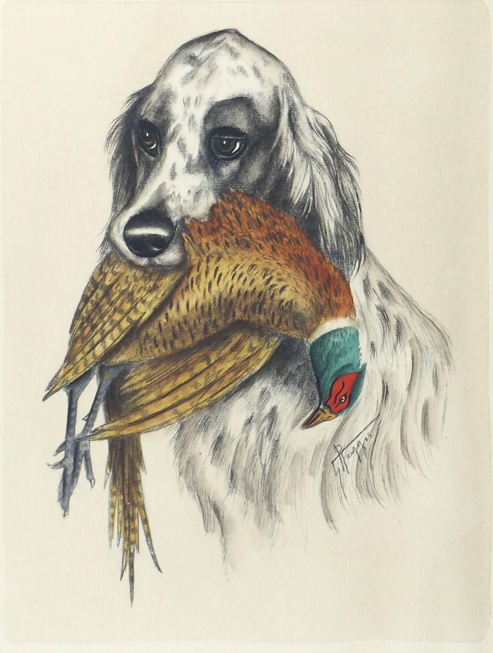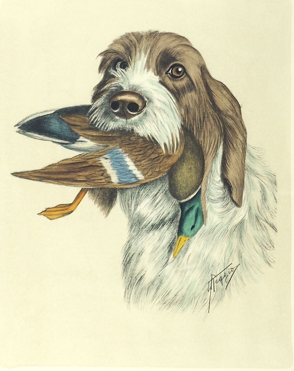 G. Reggio Lotto di 2 disegni a colori raffiguranti cani e cacciagione, cm....