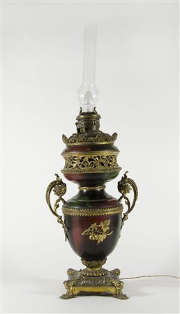 Lampada a petrolio in metallo dipinto e montatura dorata, con palla in vetro...