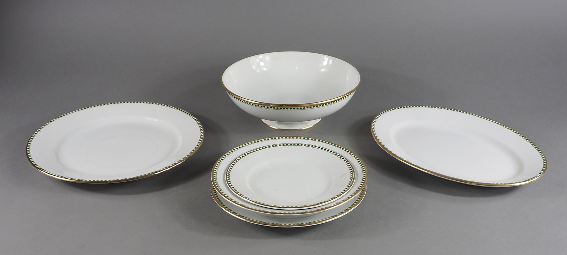 Galvani: servizio di piatti per 6 persone in porcellana con bordi dorati e verdi, composto da 21 pezzi.