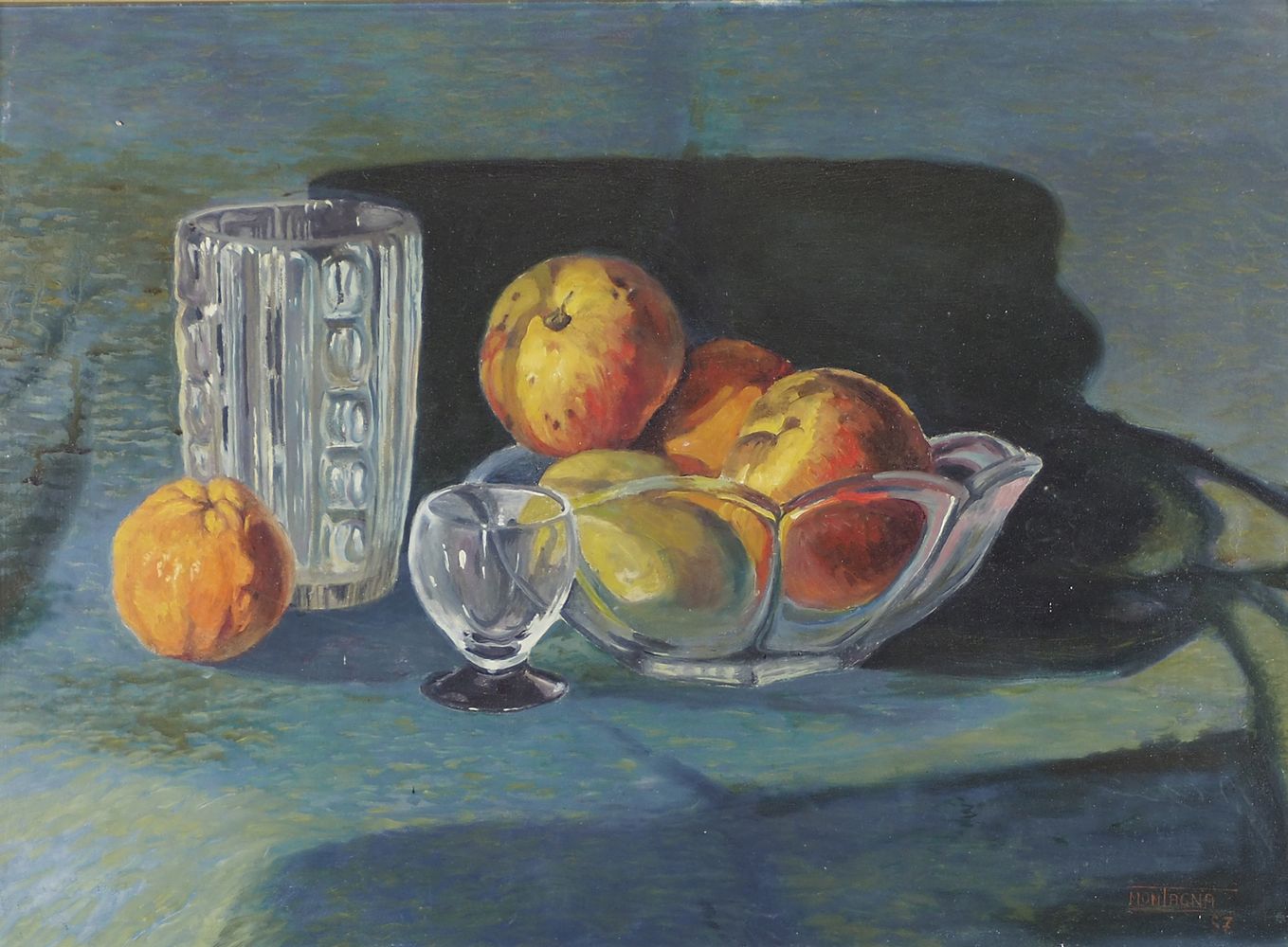 Elvino Montagna Oderzo 1880-1976 "Natura morta" cm. 50x68 - olio su tavola Firmato b. a d. e datato '57.