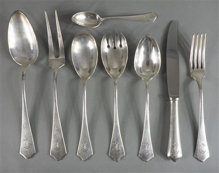 Servizio di posate da nave in metallo argentato per 6 persone con stemma. Totale 58 pezzi.