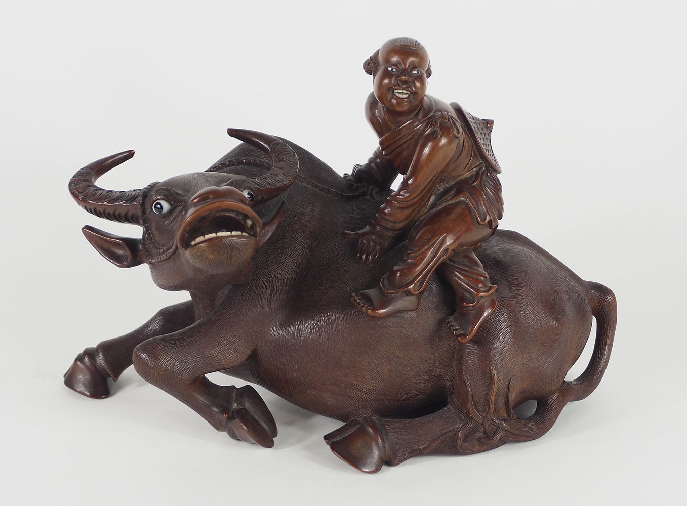 Scultura in legno scolpito raffigurante bue. Lung. cm. 32.