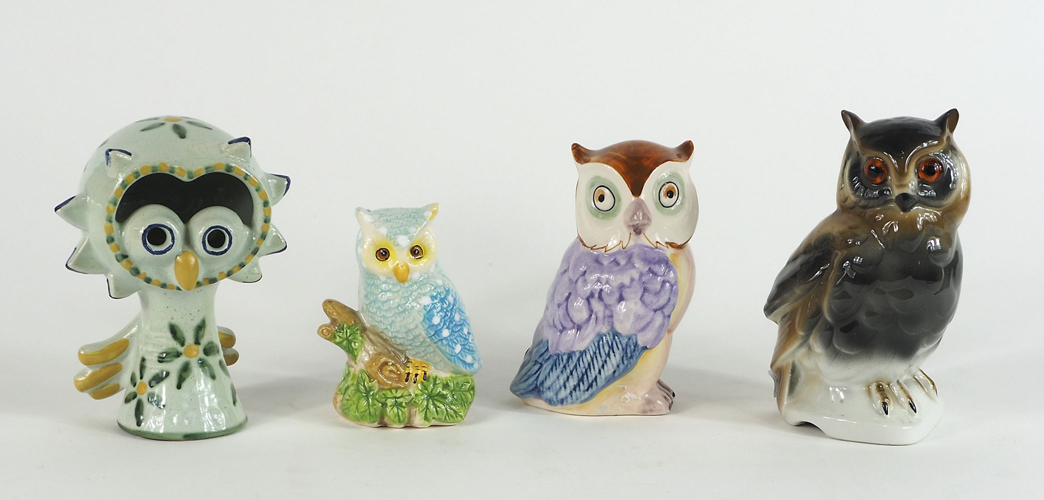 Lotto di 4 gufi in ceramica policroma. H. max cm. 16.