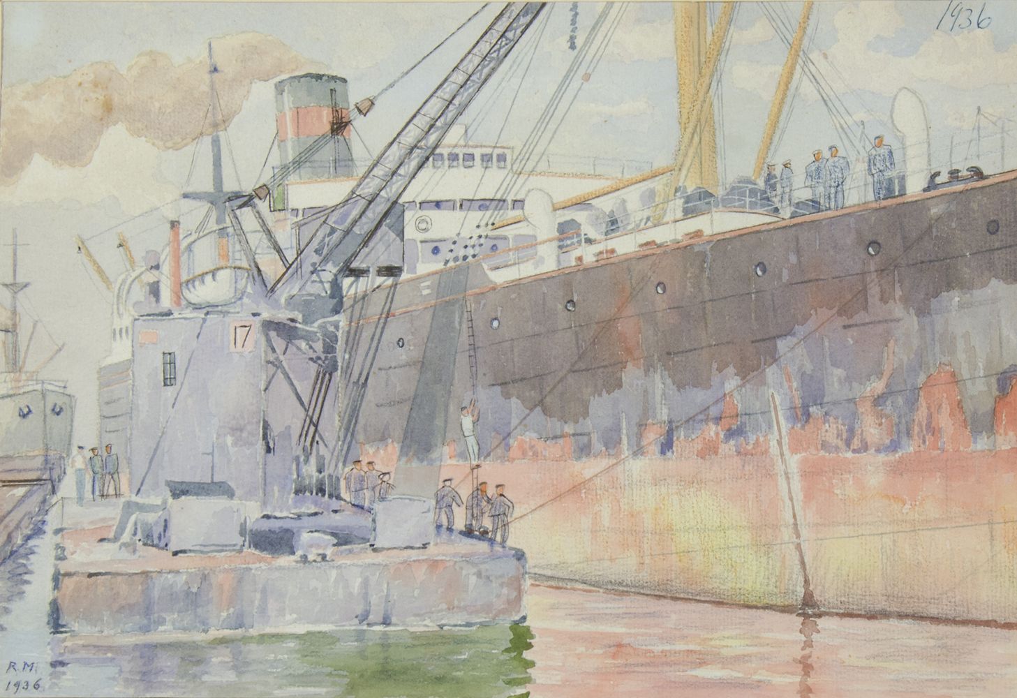 Pittore fine XIX secolo "Riparazioni sulla nave" cm. 26x38 - acquerello su carta Siglato b. a s. R.M. e datato 1936.