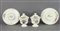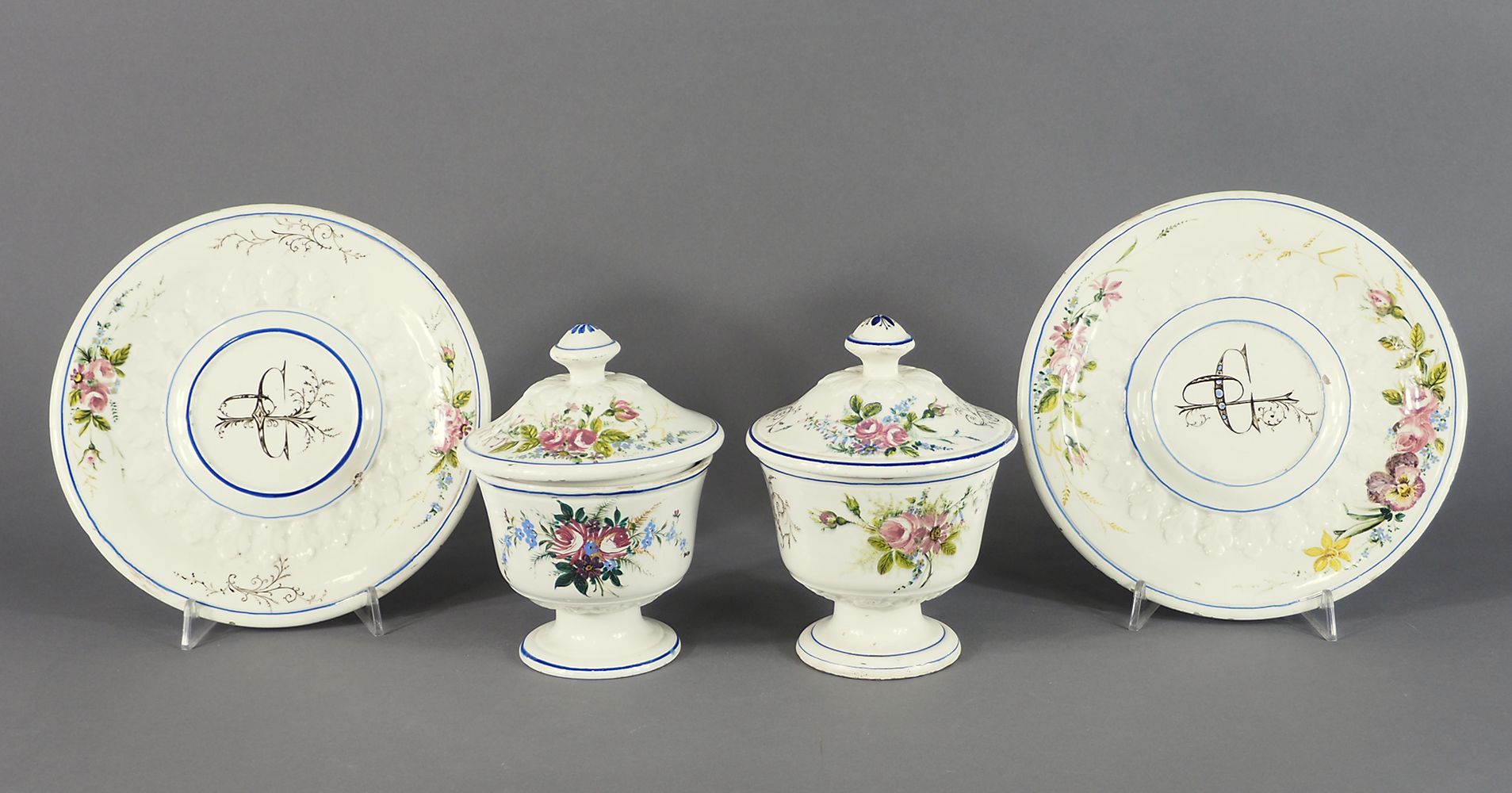 Lotto in ceramica policroma composto da coppia di vasi con coperchi e piatto....