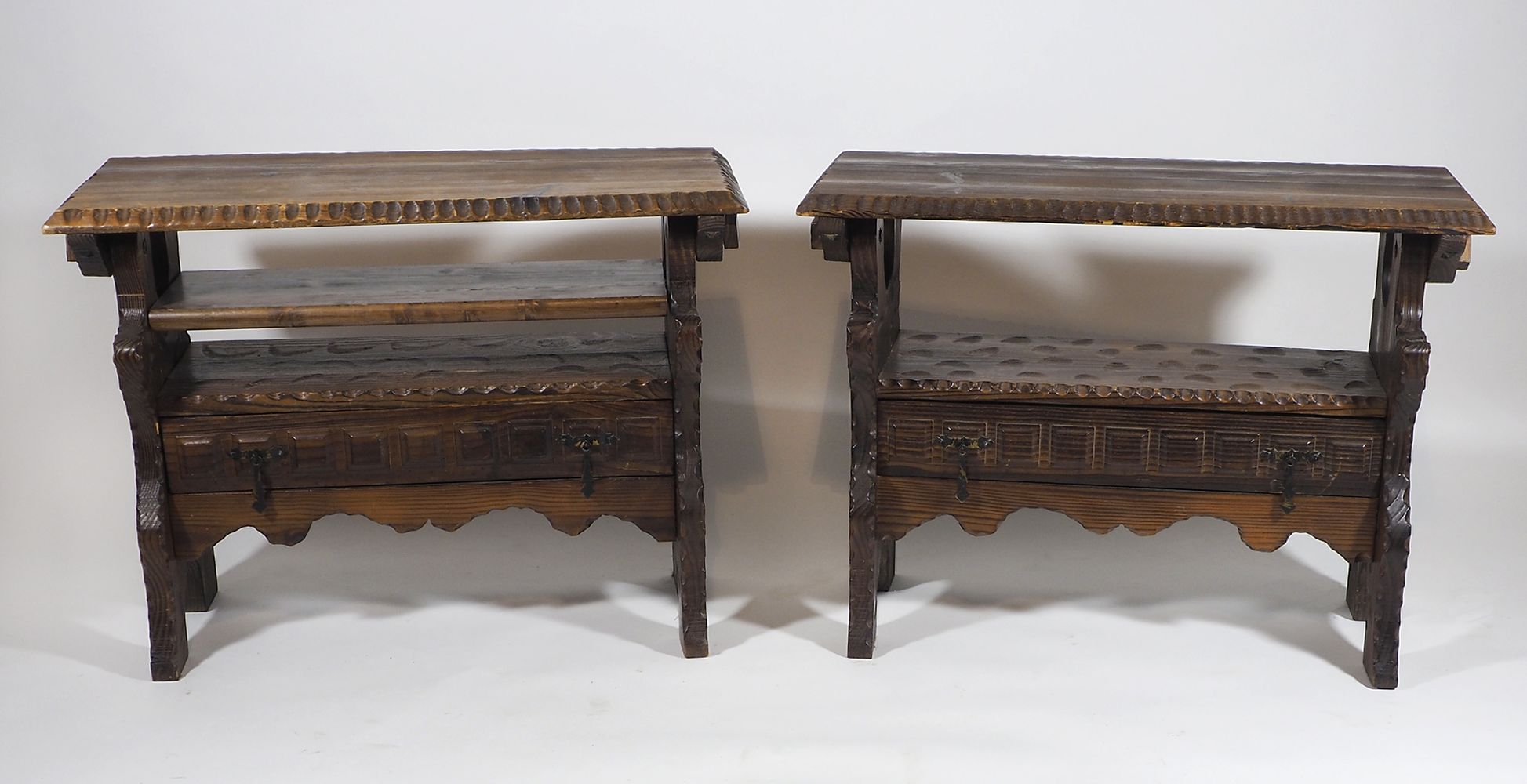 Coppia di mobiletti "spagnoli" con ripiani e cassetto.