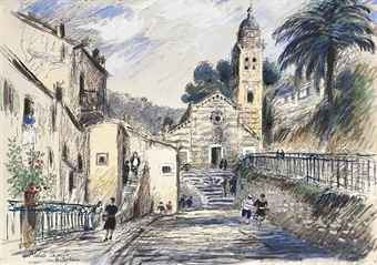 Michele Cascella (1892-1989) Portofino, chiesa di San Martino firma e titolo Michele Cascella Portofino (in basso a sinistra) acquarello e inchiostro su carta cm 32,2x45,6 Eseguito nel 1952 Autentica su fotografia dell'Archivio Generale dell'Opera di Michele Cascella a cura della Galleria Torcular, Milano, n. 52/11, in data 26 gennaio 2012 Provenance Collezione Giorgio Falck, Milano ivi acquisito dall'attuale proprietario