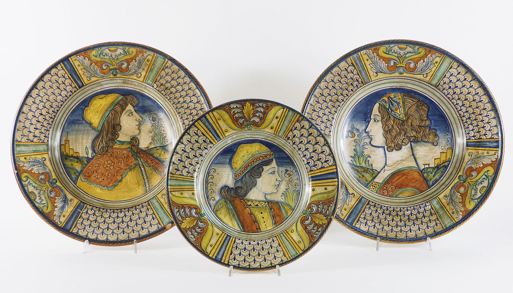 Deruta: lotto di 3 piatti in ceramica policroma. Diam. max cm. 43. (uno restauro).