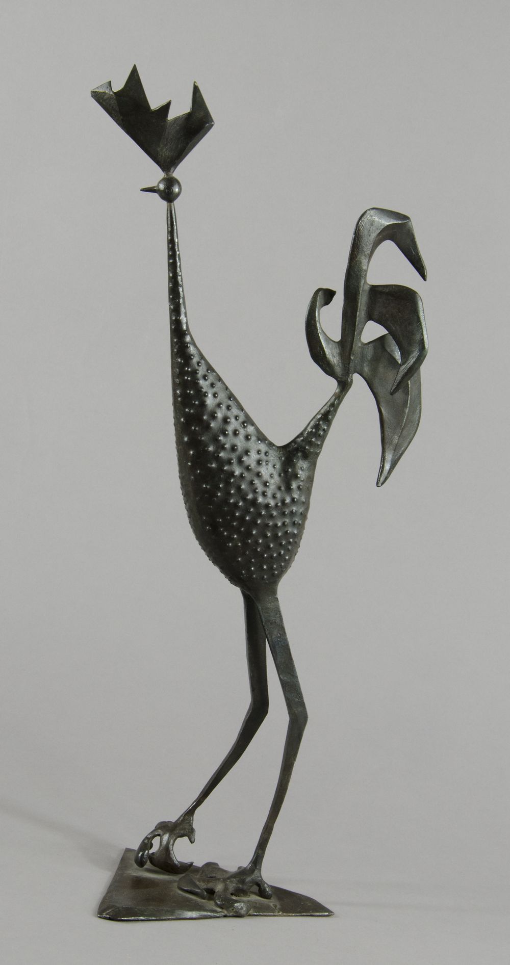 Scultura in ferro lavorato raffigurante gallo. Firmato Bassi sulla base. H. cm. 47.