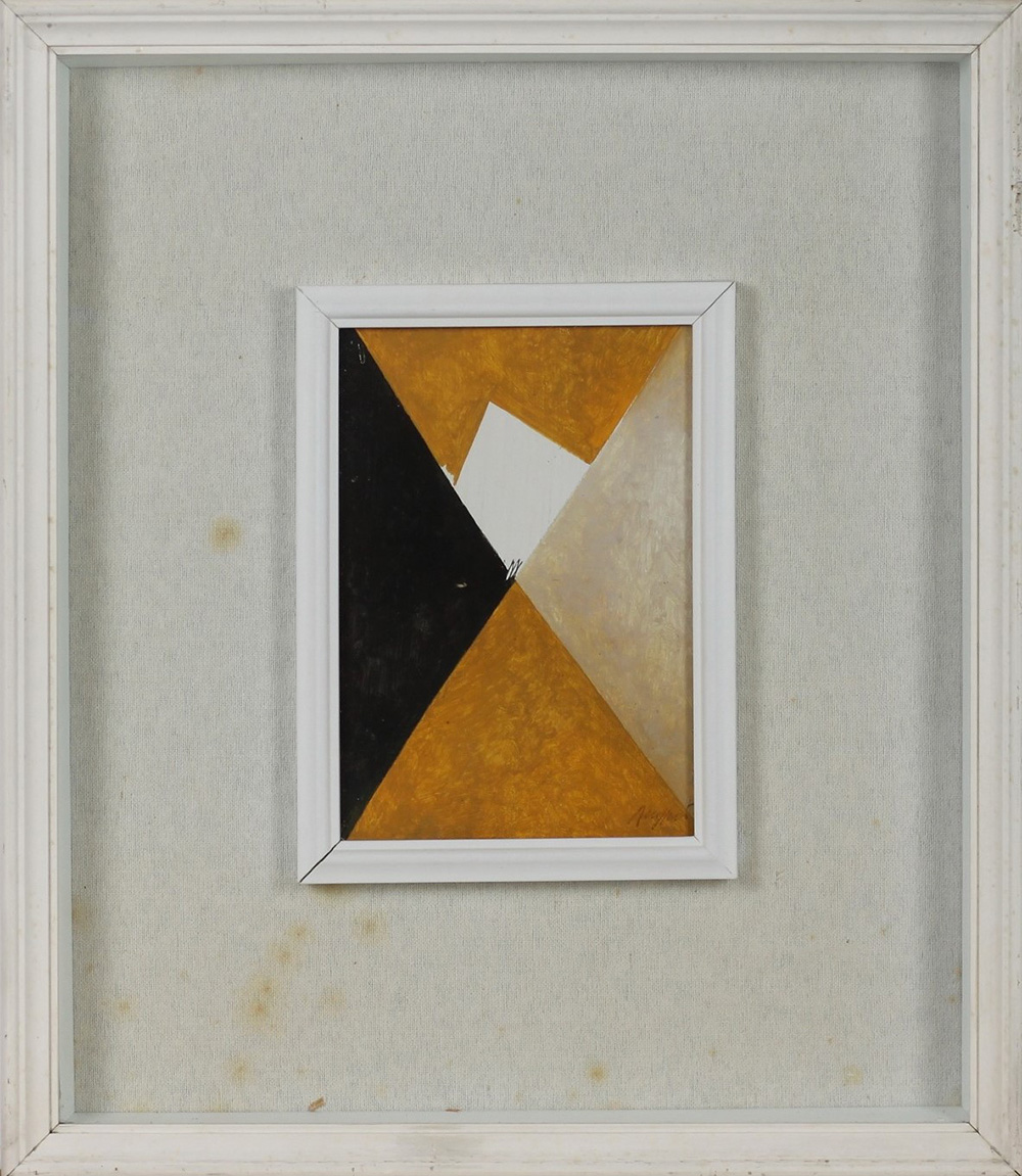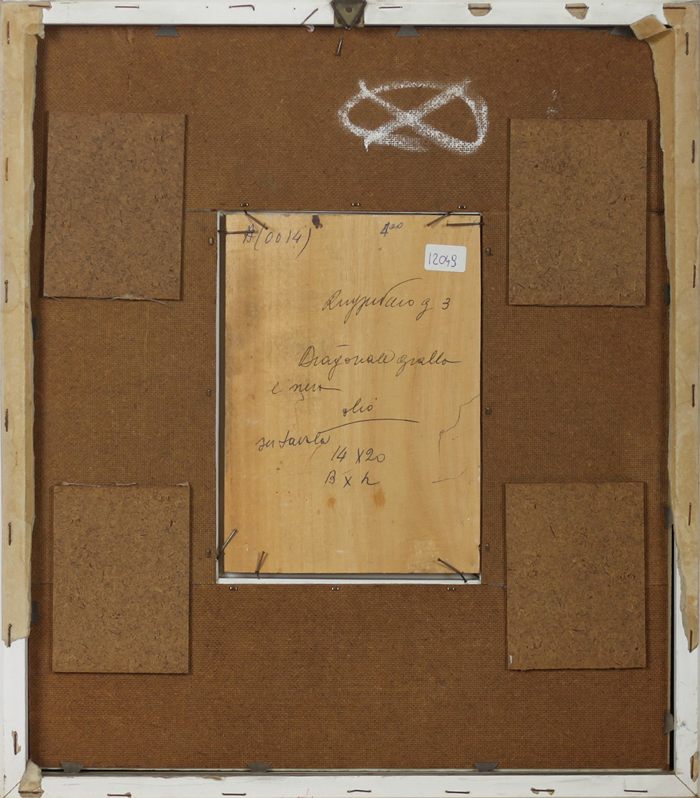 PIERO RUGGERI, Diagonale giallo e nero, Olio su tavola Anno 1974 Dim. 20x14 Al verso dimensioni, tecnica, titolo e firma Firmato in basso a dx