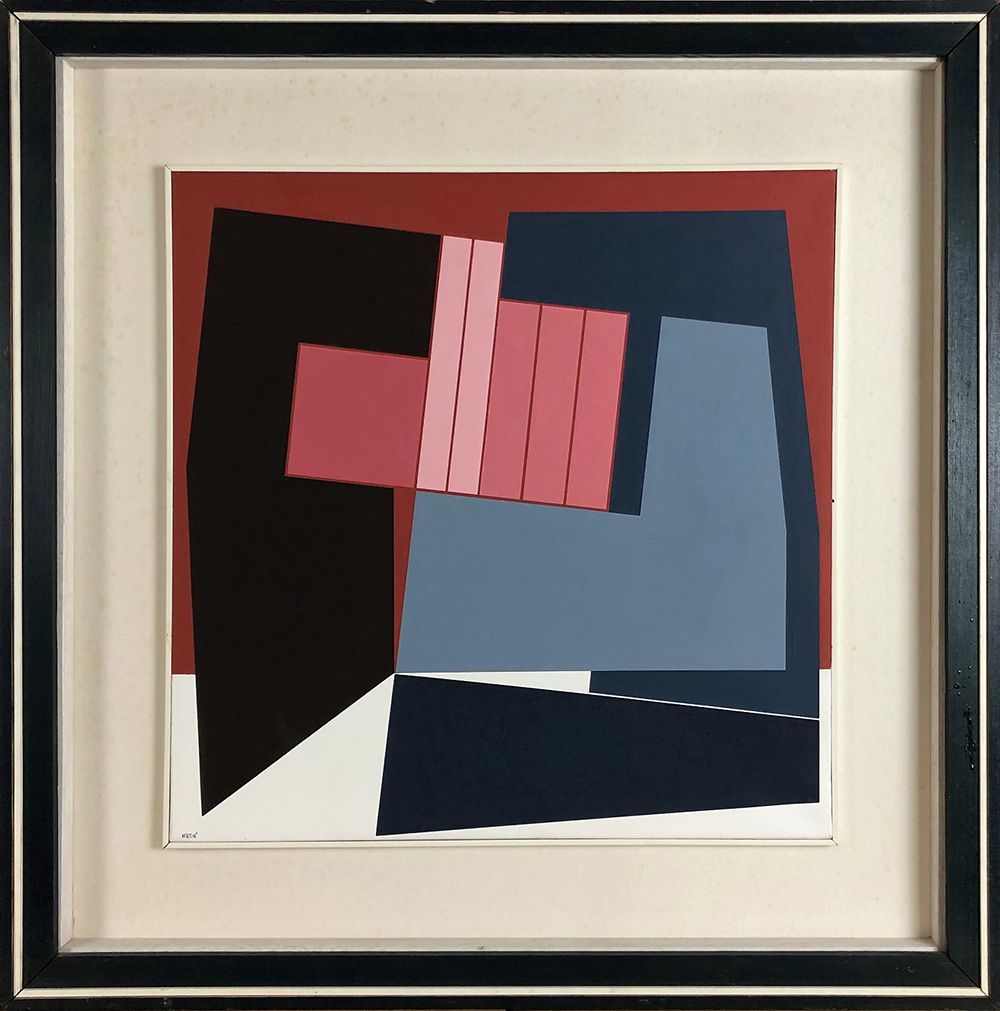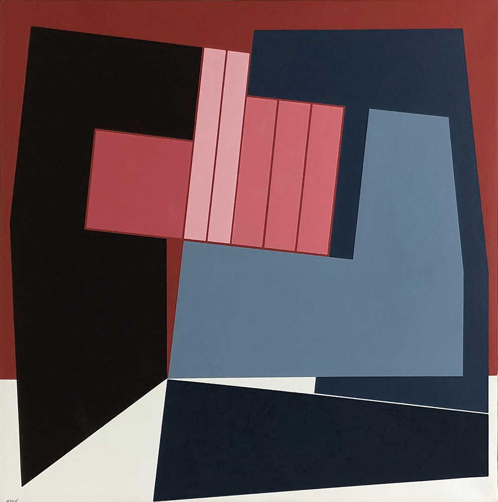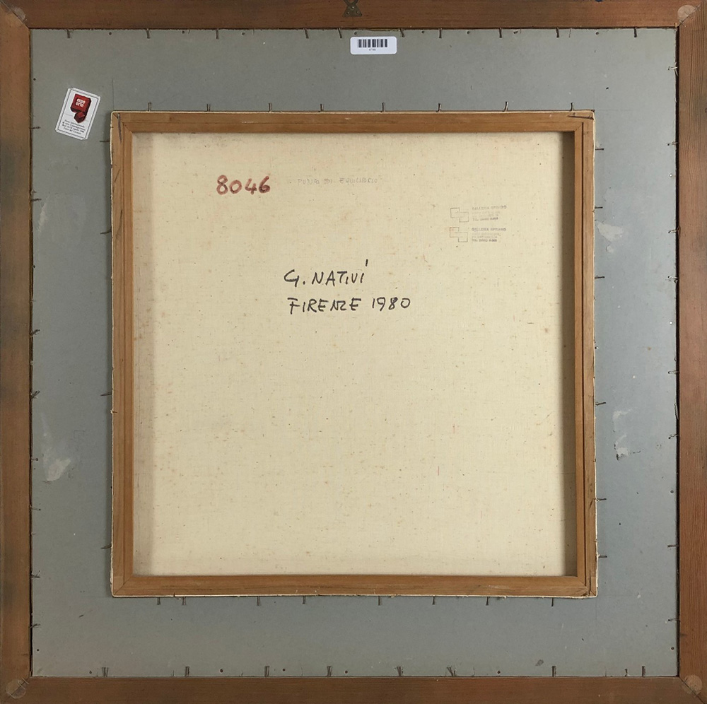 GUALTIERO NATIVI, Punto di equilibrio, Olio su tela Anno 1980 Dim. 53x53 Opera archiviata al N.8046 Al verso Etichetta "Expo Arte Fiera Internazionale di Arte Contemporanea, Bari 1988, Fiera del Levante". Al verso titolo, data e firma Firmato in basso a sx