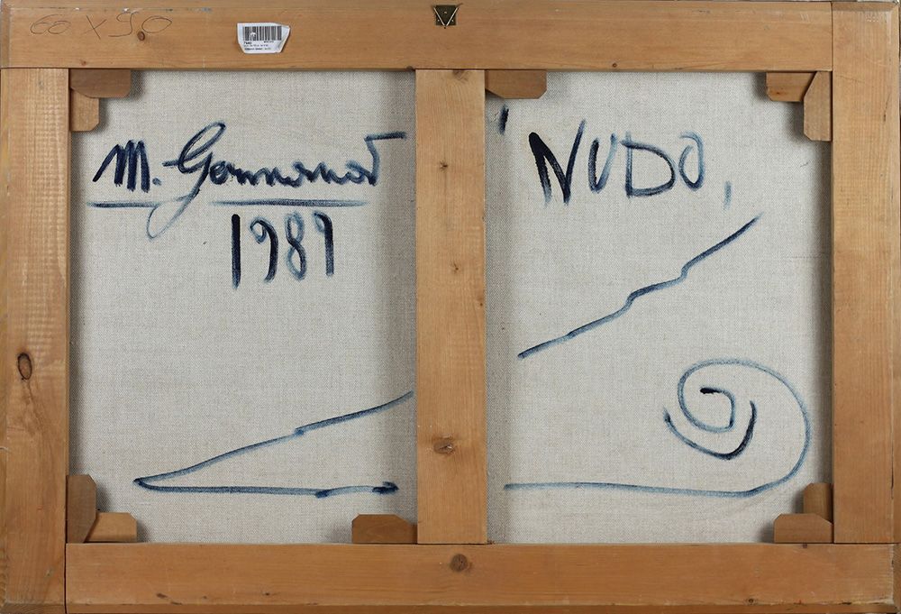 MIMMO GERMANA', Nudo, Olio su tela Anno 1989 Dim. 60x90 Opera senza cornice Provenienza collezione privata Opera archiviata al N.821 presso Archivio Generale dell'Opera Pittorica Mimmo Germanà Opera accompagnata da certificato di autenticità e garanzia a cura della Galleria d'Arte L'Acquario (Giulianova) Al verso data,titolo e firma