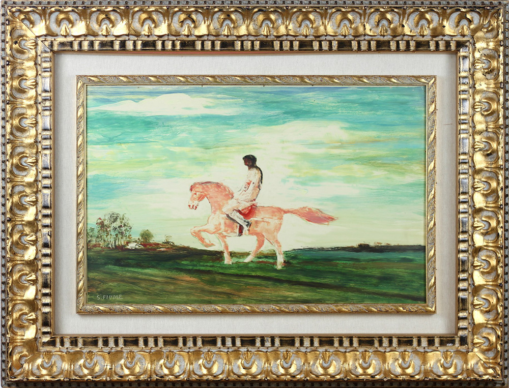 SALVATORE FIUME, Cavaliere, Olio su faesite Dim. 35x55 Autentica su foto da parte della figlia di Salvatore Fiume in data 19/10/2006 Firmato in basso a sx