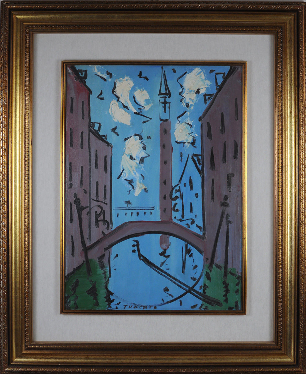 GIULIO TURCATO, Veduta di venezia, Olio su tela Anno 1969 Dim. 70x50 Verbale di perizia N.786/R a cura di Finanrte Case d'Aste Spa Al verso etichetta "Collezione Passalacqua" Roma Firmato in basso al centro