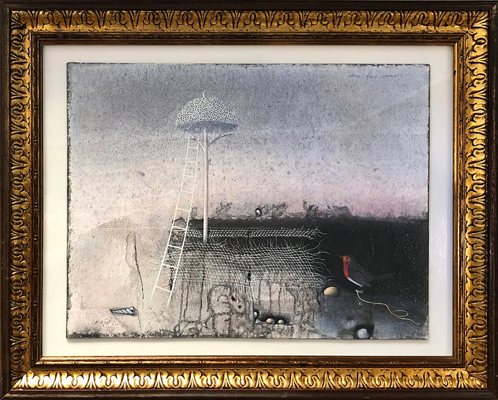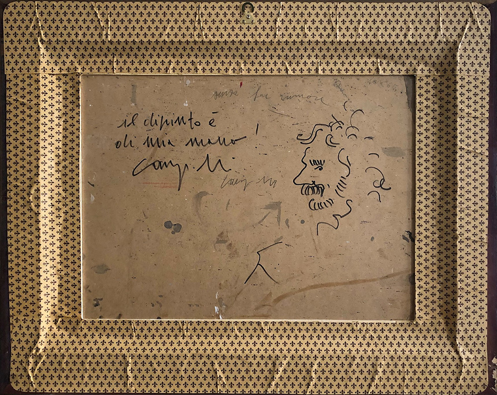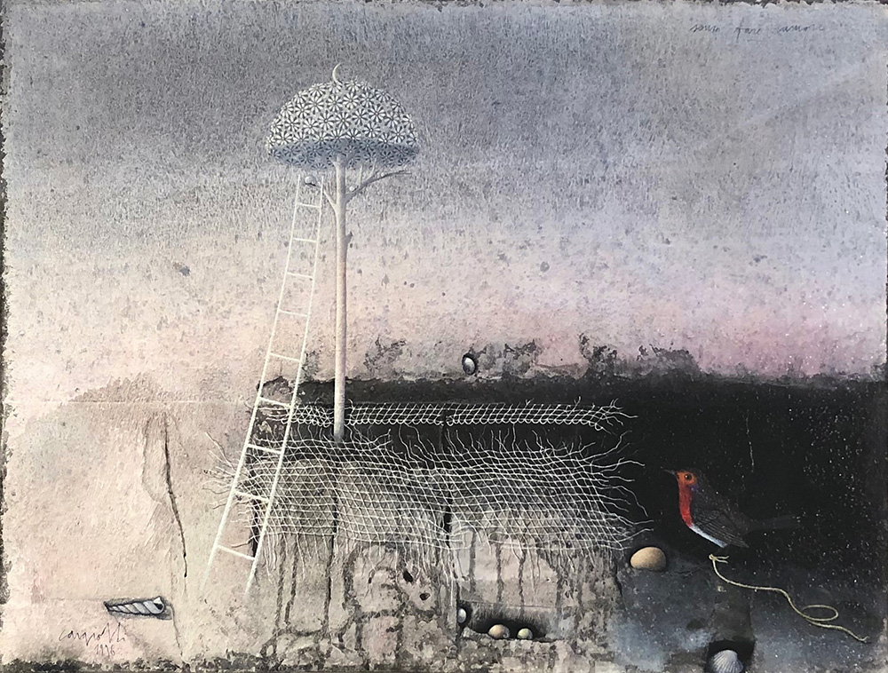 CLAUDIO CARGIOLLI, Senza far rumore, Olio su tavola Anno 1996 Dim.48x65 Autentica su foto dell’artista Al verso titolo, autentica dell’artista, firma e altra composizione Firmato e datato in basso a sx