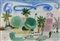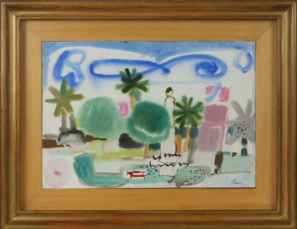 ENRICO PAOLUCCI, Lungomare, Gouache su carta/tavola Anno 1970 Dim.33x48 Autentica su foto dell'artista Al verso etichetta con dati Firmato in basso a dx
