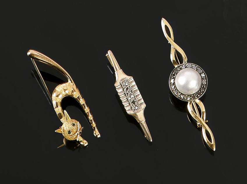 LOTTO DI TRE SPILLE Lotto composto da tre spille in oro giallo, bianco ed argento con diamanti perle, piccoli smeraldi e un rubino Peso gr. 17