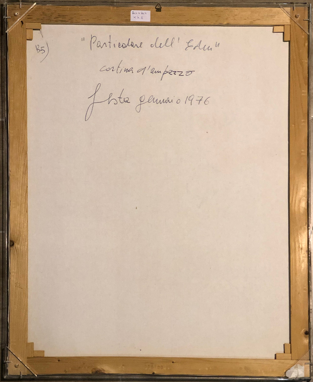 TANO FESTA, Particolare dell'Eden, Acrilici su tela Anno 1976 Dim. 100x80 Opera archiviata al N.B100610/470 presso Archivio delle Opere Tano Festa in data 03/02/2004 Opera accompagnata da certificato di autenticità Provenienza Autore Siglato dall'autore "B5" Al verso titolo, data e firma