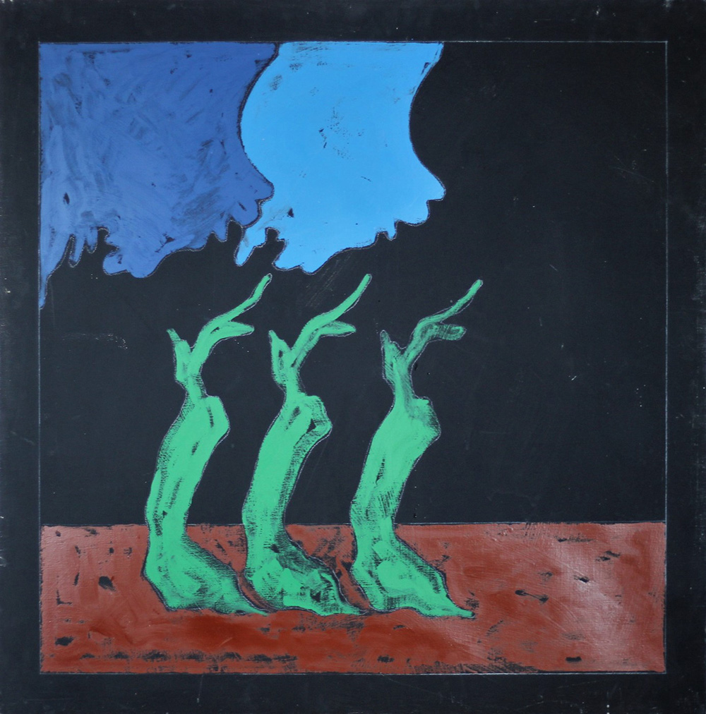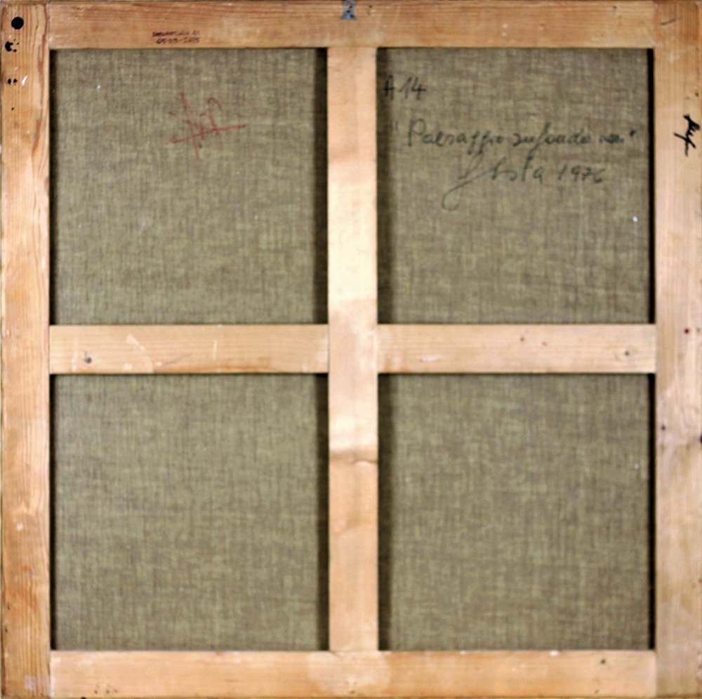 TANO FESTA, Paesaggio su fondo nero, Acrilico e smalto su tela Anno 1976 Dim. 100x100 Opera archiviata al N.RMS76100620128 presso Studio Soligo Archiviazione Opere Tano Festa Al verso data, titolo e firma